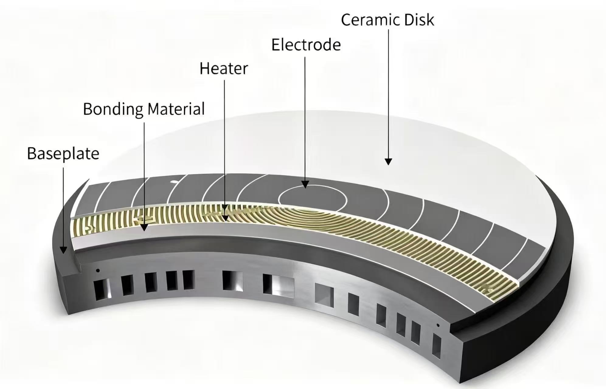 Деякі керамічні електростатичні патрони мають інтегровані функції нагріву, які можуть точно контролювати температуру пластини за допомогою зворотного видувного газу або внутрішніх нагрівальних електродів, адаптуватися до строгих температурних вимог різних процесів і підвищити стабільність обробки.