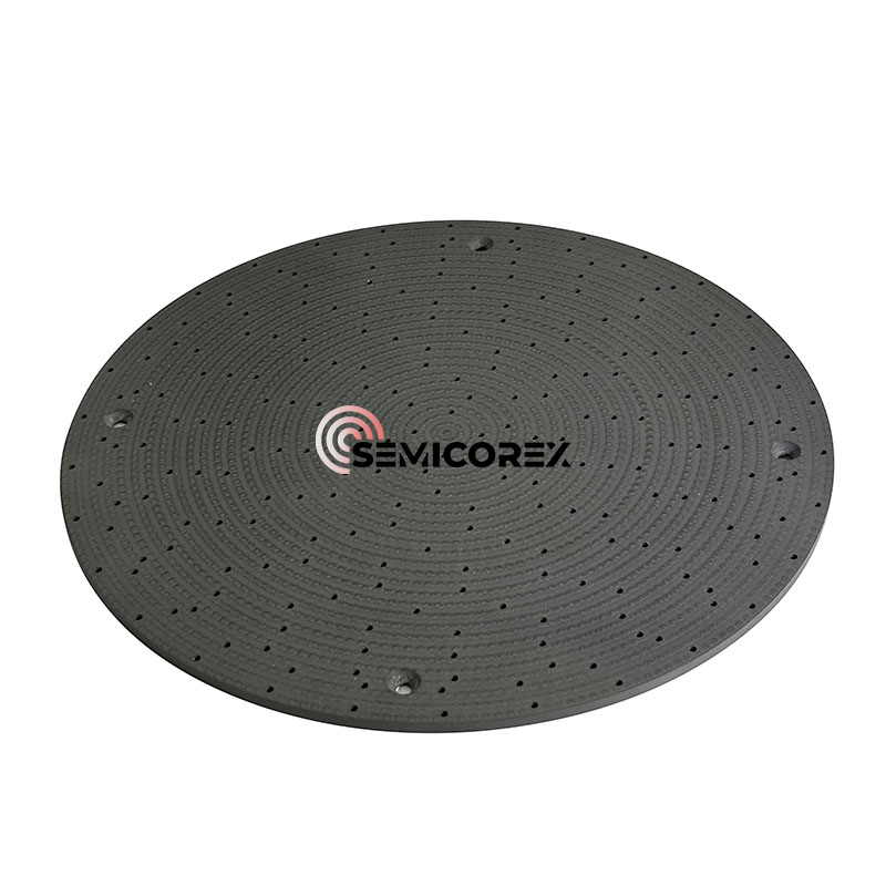 Під час процесу реакції вафельна поверхня пластини розподілу газу щільно покрита мікропорами (діафрагма 0,2-6 мм). Через точно розроблену структуру пор та газовий шлях, спеціальний технологічний газ повинен проходити через тисячі невеликих отворів на рівномірній газовій пластині, а потім рівномірно осідати на поверхні вафлі. Шари плівки в різних областях вафлі повинні забезпечити високу рівномірність та послідовність. Тому, крім надзвичайно високих вимог до чистоти та резистентності до корозій, пластини розподілу газу мають суворі вимоги щодо узгодженості діафрагми невеликих отворів на рівномірній газовій пластині та зади на внутрішній стінці невеликих отворів. Якщо толерантність до розміру діафрагми та стандартне відхилення консистенції занадто великі або на будь -якій внутрішній стінці є пори, товщина осадженого плівкового шару буде непослідовною, що безпосередньо вплине на вихідний процес обладнання. У процесах, що допомагають у плазмі (таких як PECVD та сухе травлення), душова головка, як частина електрода, генерує рівномірне електричне поле через джерело живлення РФ для сприяння рівномірному розподілу плазми, тим самим покращуючи рівномірність травлення або осадження.