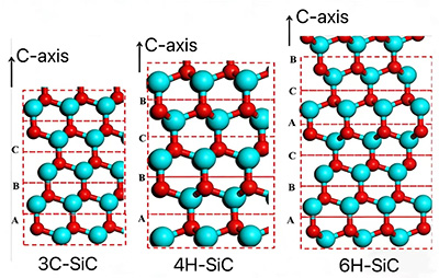 Звичайно, матеріал SiC складається не з одного тетраедра з одного атома Si та одного атома C, а з незліченної кількості атомів Si та C. Велика кількість атомів Si і C утворюють хвилясті подвійні атомні шари (один шар атомів C і один шар атомів Si), а численні подвійні атомні шари утворюють кристали SiC. Через періодичні зміни, що відбуваються під час процесу укладання подвійних атомних шарів Si-C, наразі існує понад 200 різних кристалічних структур із чітким розташуванням. В даний час найпоширенішими кристалічними формами в практичних застосуваннях є 3C-SiC, 4H-SiC і 6H-SiC.